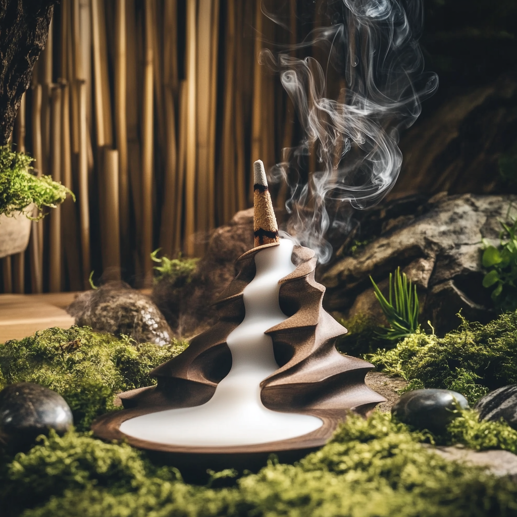 Uno de los principales atractivos de una cascada de incienso es el efecto visual que genera, creando un momento de relajación total. Con los conos de incienso de reflujo se desprende humo aromático y denso, que va bajando lentamente por el diseño del quemador.